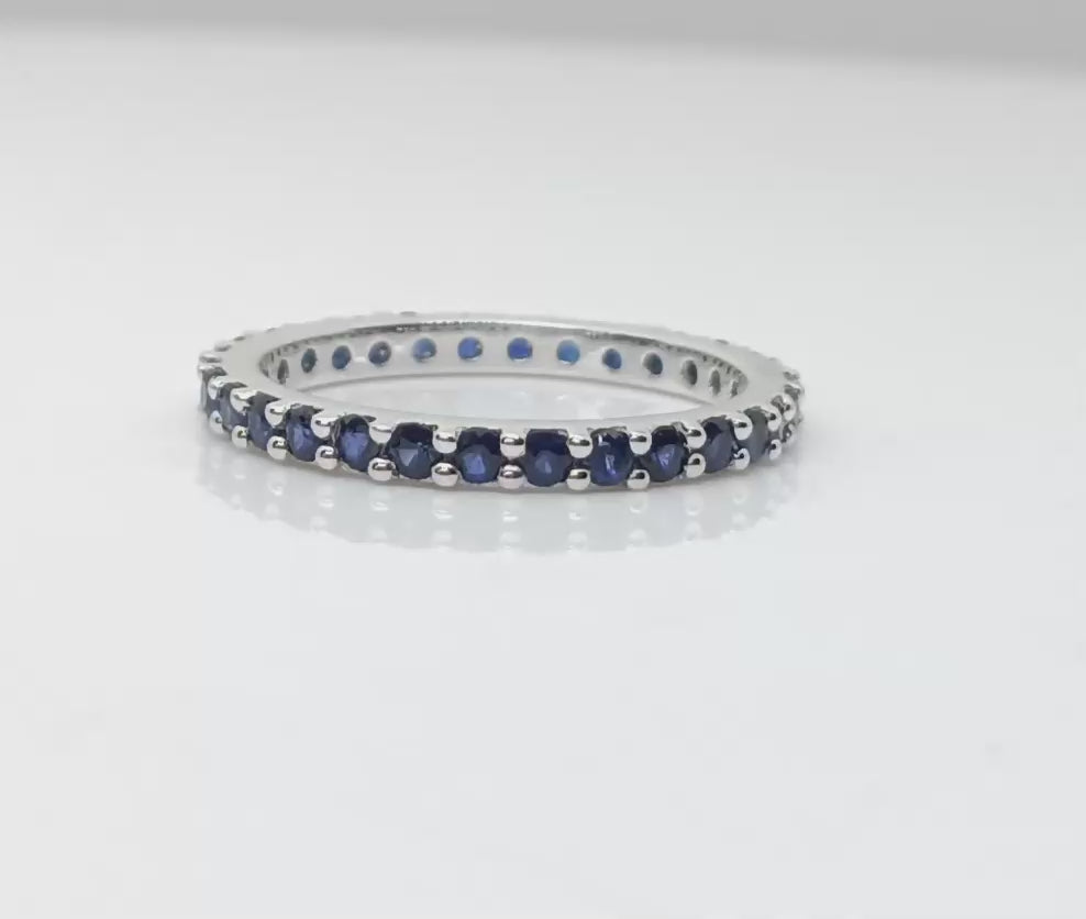 Add a regal touch of deep blue elegance to your jewelry collection with this stunning blue sapphire eternity band. Crafted in solid 925 sterling silver, it features a full circle of natural 2MM round blue sapphires (approx. 0.95 carat total weight) meticulously set around the band. The slim, polished design allows the rich blue hue to stand out beautifully, making it perfect for stacking, wearing solo, or celebrating life’s meaningful milestones with a piece that radiates classic sophistication.