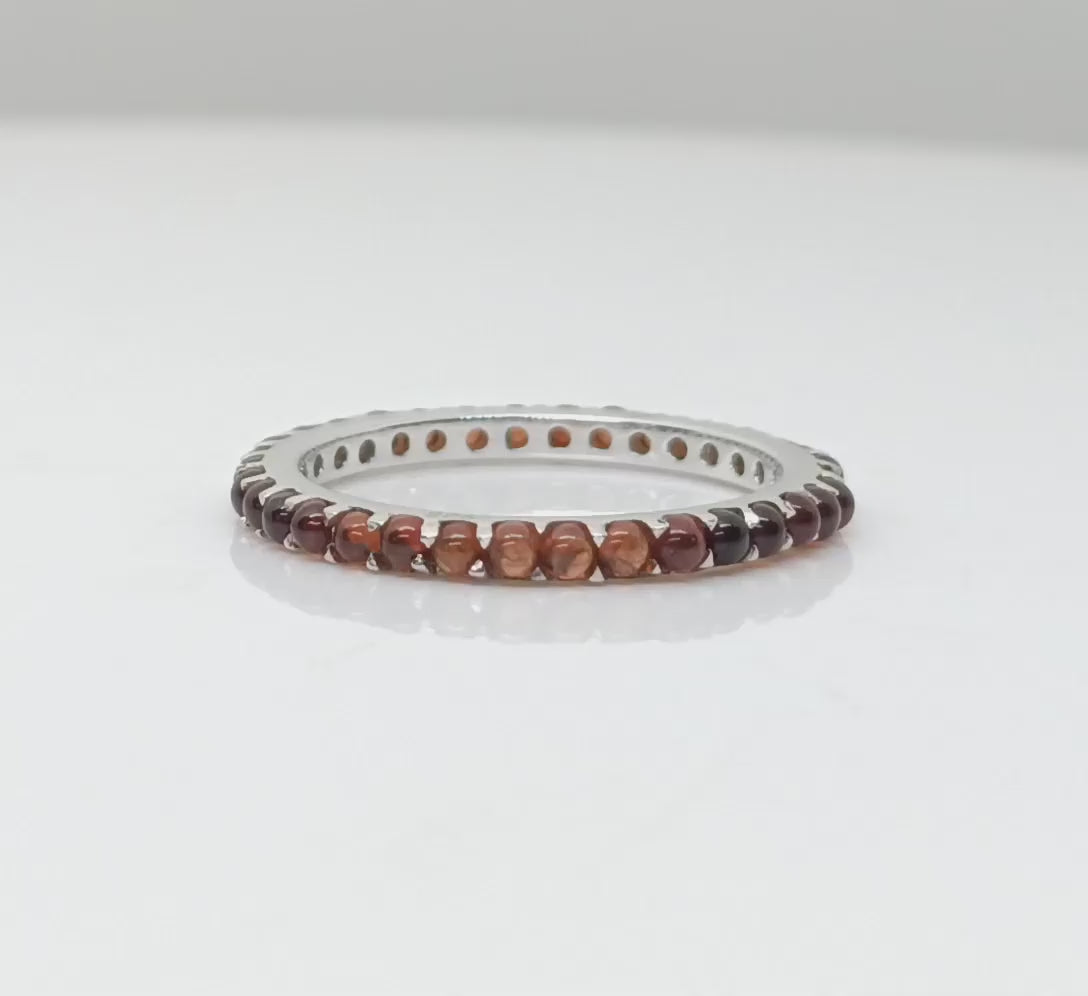 Elegant eternity band fully set with rich round garnets for continuous deep red sparkle.