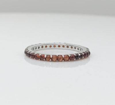 Add a timeless touch of romantic red to your jewelry collection with this stunning garnet eternity band. Crafted in solid 925 sterling silver, it features a full circle of natural 2MM round garnets (approx. 0.95 carat total weight) meticulously set all around the band. The slim, polished design highlights the garnet’s rich, passionate color, making it perfect for stacking, wearing solo, or celebrating life’s special milestones with a piece that radiates classic elegance.