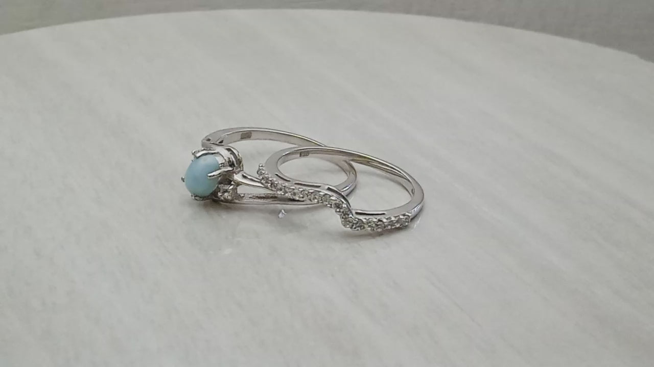 Elegant two-piece ring set with oval-cut larimar and matching contour band