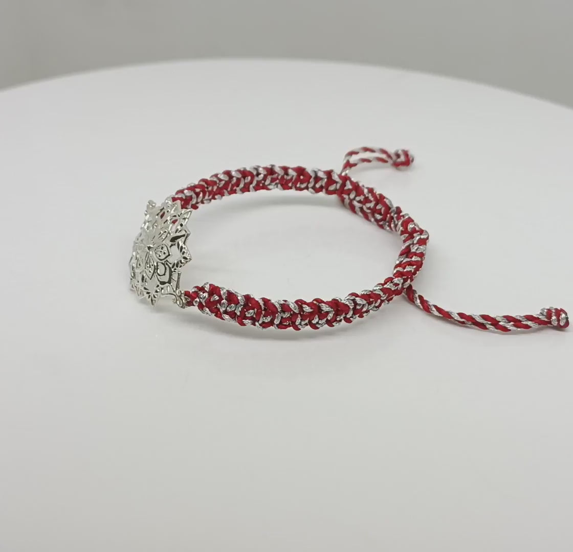 Add an artistic touch to your ensemble with this beautifully handcrafted bracelet. Featuring a vibrant red and white braided cord, it’s highlighted by an ornate silver-tone mandala charm with delicate floral detailing. Adjustable for a perfect fit, this bracelet seamlessly blends traditional artistry with modern boho chic, making it ideal for daily wear or special occasions.