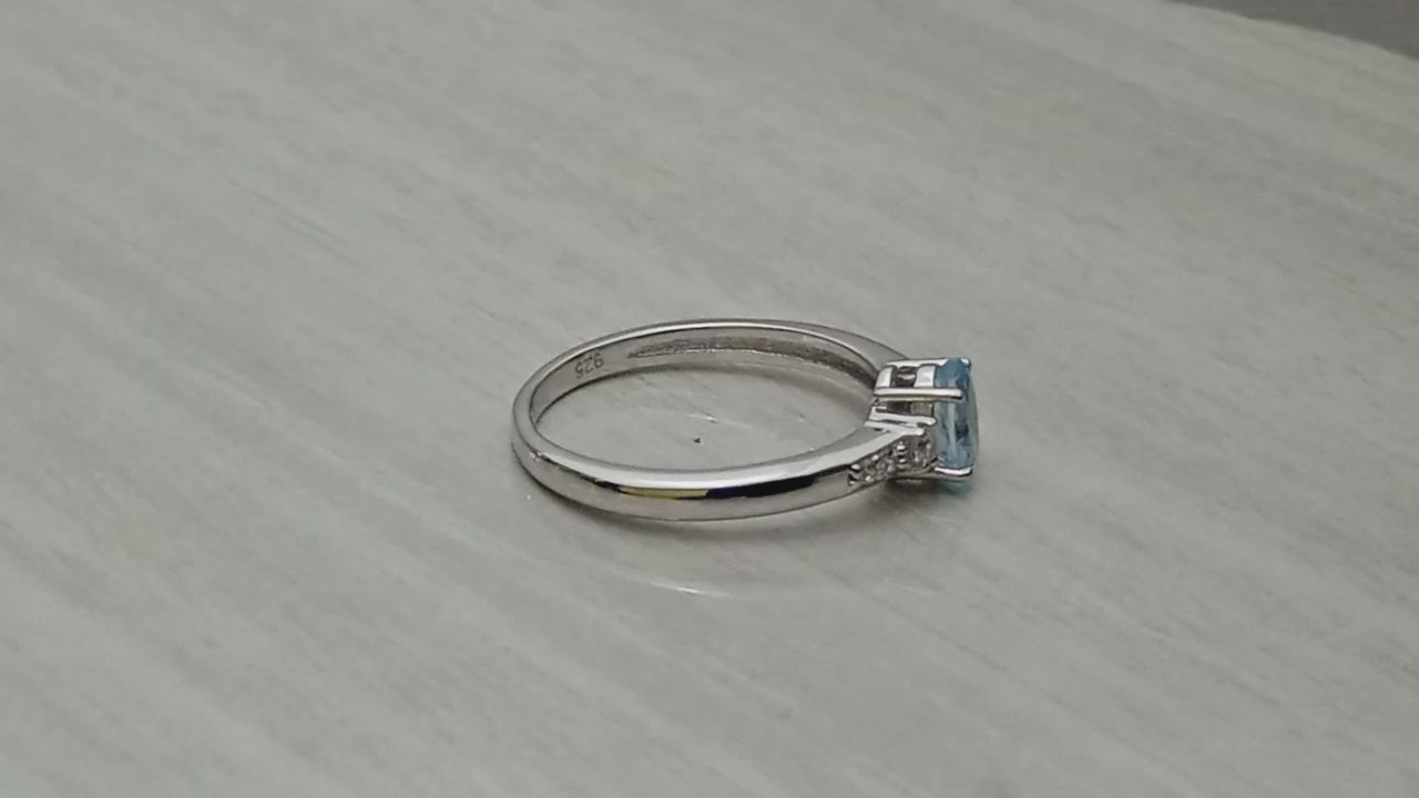 Bright and graceful, this engagement ring features a captivating 6x4 mm oval-cut blue topaz at its center, beautifully accented by delicate white stones along the band. Crafted in polished 925 sterling silver, the vivid sky-blue hue of the topaz symbolizes clarity and calm, adding a cheerful yet sophisticated touch. Ideal as an engagement ring, anniversary piece, or meaningful gift, this design blends timeless elegance with refreshing color.