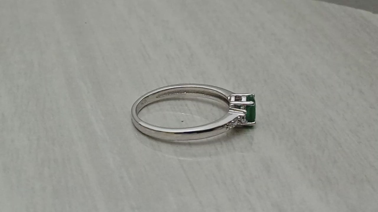 Rich and timeless, this engagement ring showcases a captivating 6x4 mm oval-cut emerald at its center, beautifully accented by delicate white stones along the band. Crafted in polished 925 sterling silver, the lush green hue of the emerald symbolizes love, growth, and prosperity. Perfect as an engagement ring, anniversary piece, or meaningful gift, this design blends classic elegance with a vibrant splash of color.