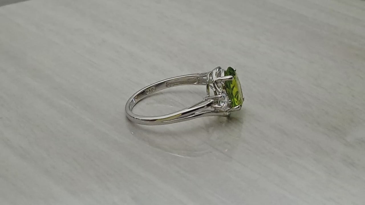 Celebrate timeless elegance with this vibrant Peridot ring, featuring a luminous 8x6 mm oval-cut gemstone nestled between two sparkling white topaz accents. Expertly crafted in 925 sterling silver, the split shank design enhances its classic three-stone layout, making it a meaningful gift or a bright addition to your everyday jewelry collection.