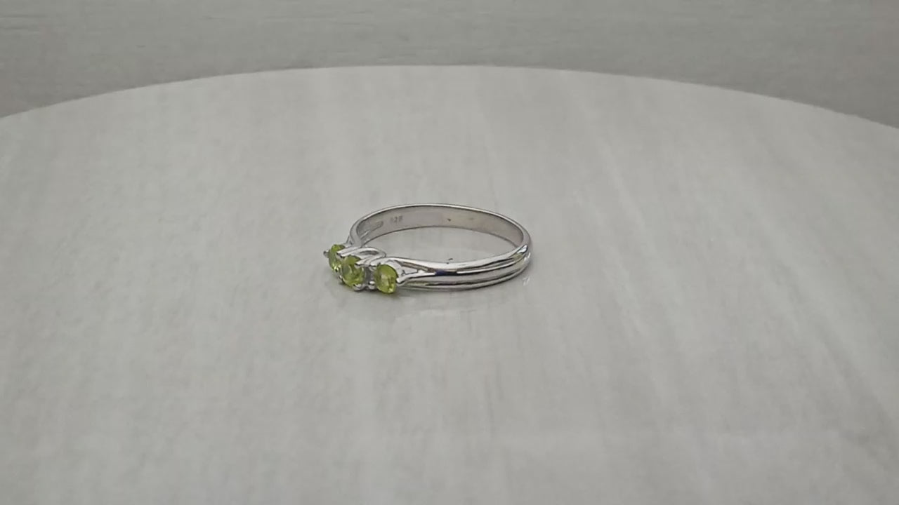 Fresh and joyful, this trilogy ring features three luminous 3 mm round-cut peridots set in platinum plated 925 sterling silver. The bright green hue of natural peridot symbolizes renewal and happiness, while the elegant three-stone design represents the past, present, and future. Perfect as an anniversary ring, promise ring, or thoughtful gift, this piece brings cheerful elegance to any jewelry collection.