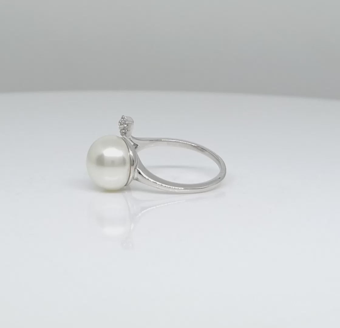 Embrace delicate beauty with this nature-inspired pearl ring, featuring a radiant 10x10 mm round pearl cradled between two CZ-studded leaf motifs. The open bypass design captures the softness of organic form while offering a graceful and contemporary silhouette.