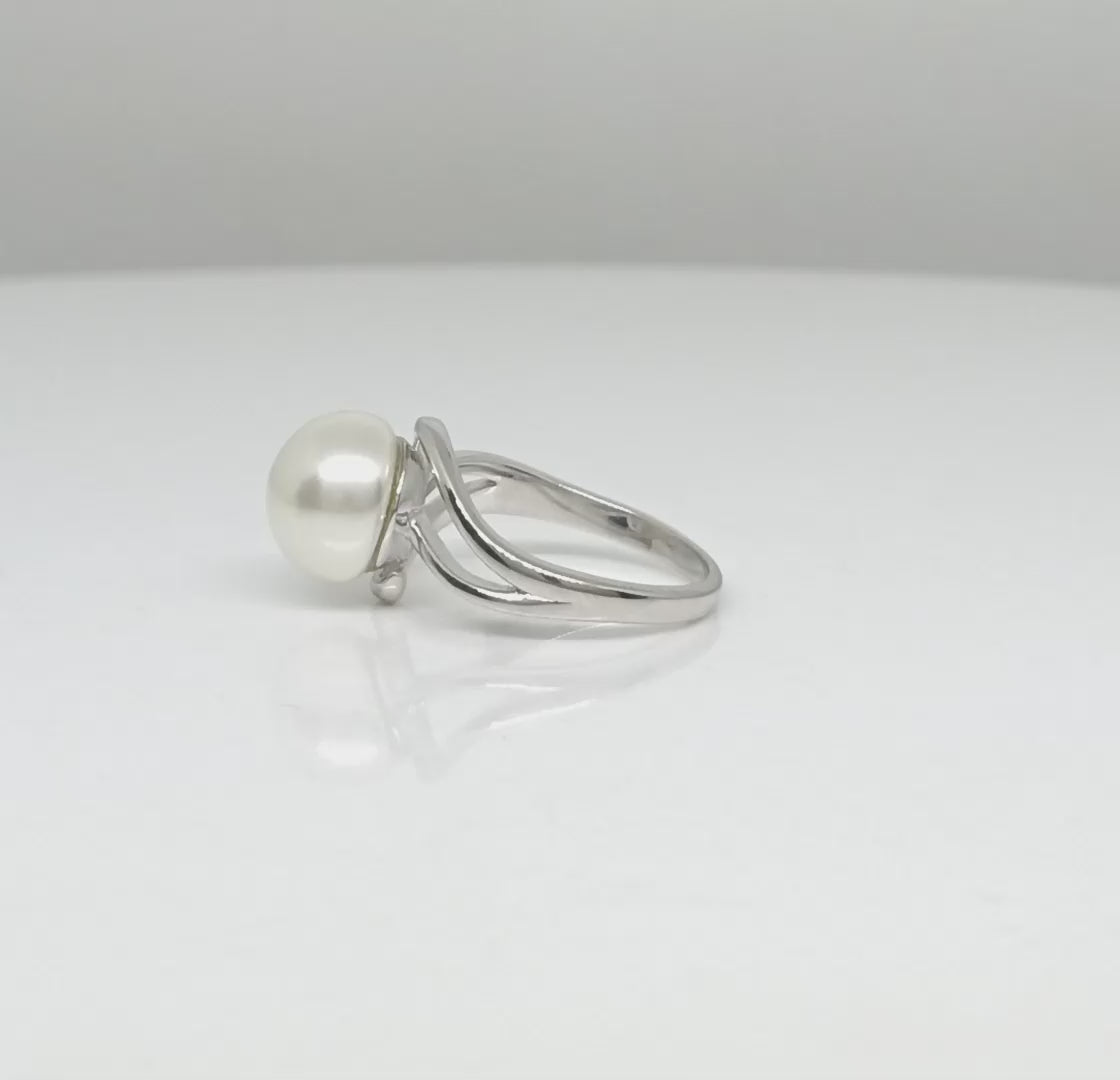 This elegant ring showcases a luminous 10x10 mm round pearl, gracefully set in a flowing swirl band. The sleek, modern design adds a contemporary flair to the timeless beauty of the pearl, making it a standout piece for both everyday elegance and special occasions.
